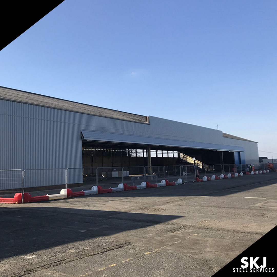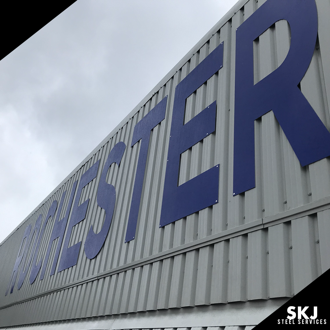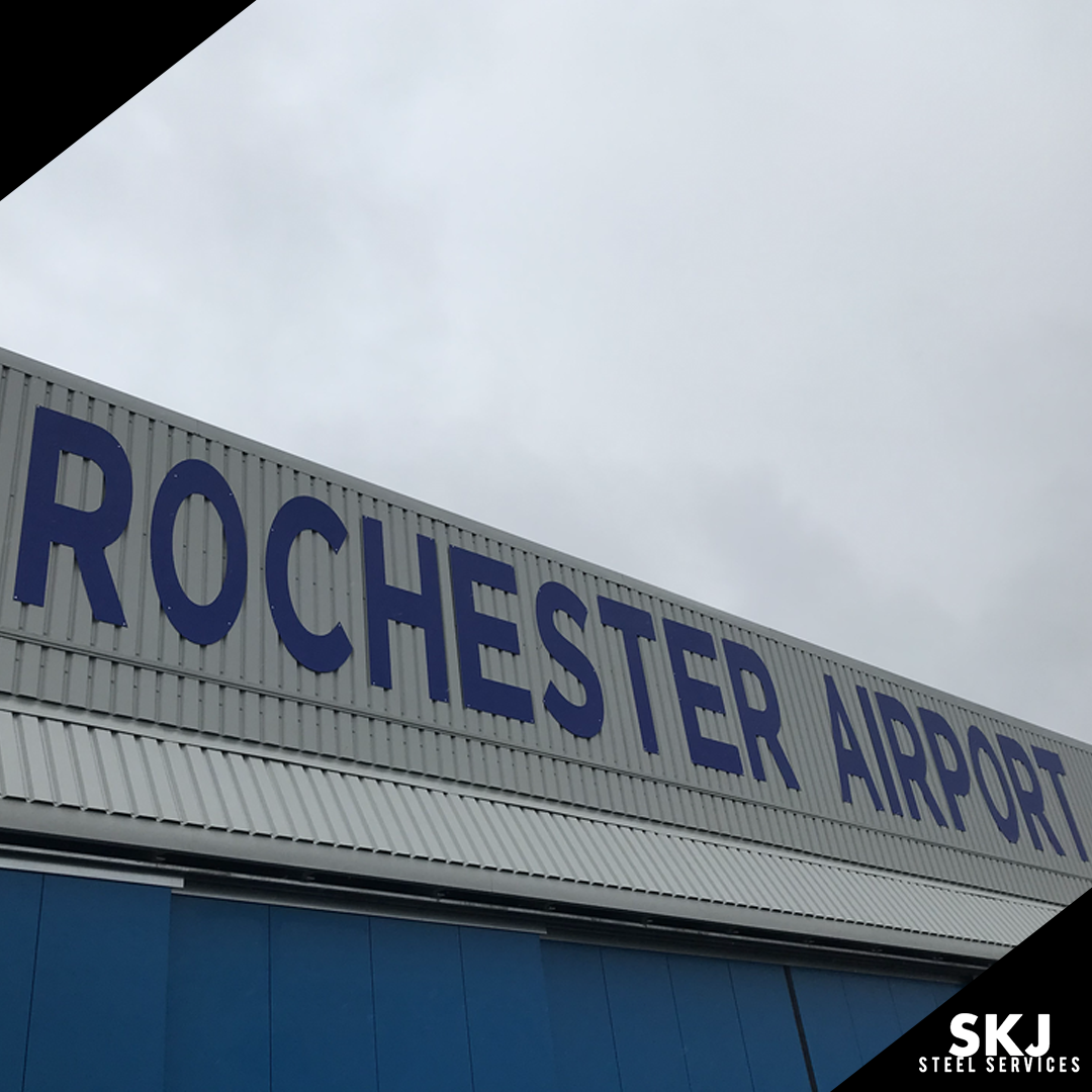 Rochester Airport was a project where SKJ Steel Services had to design, fabricate, repair and install, taking a very old building and giving it a new life. Starting the project with complete steel repairs on the columns, adding new plates to strengthen the original steel, changing corroded rivets and new structural steel to give the building more strength. The original truss was then painted with more than 280 micros to last thought out the years to come. Once all the repairs were completed, new steel could start to be fitted, we supplied all designs and working with Kier to create an amazing new building. We added 3 new columns either side of the hanger to take Perlins when it came to hanging cladded sheets, we then went on to install the new canopy which sits in the middle of the building for the new door to hang to. The new canopy gave the building a great new look with added protection. Once the new canopy was installed, Perlins could be set ready to take the new cladding. The perils were set, and it was important to be level and in line, so no cladding sheets would not bulge. The SKJ team then moved onto the cladding sheets and installed working from left to right of the building, using MEWPS, lining and levelling so that the sheets look perfect, all cladding was then finished with fashings to give the building this finishing touches and really give this building a new life. Hanger 3 at Rochester Airport was then finished with the iconic lettering profiled and installed by the SKJ operatives. Please see the photos