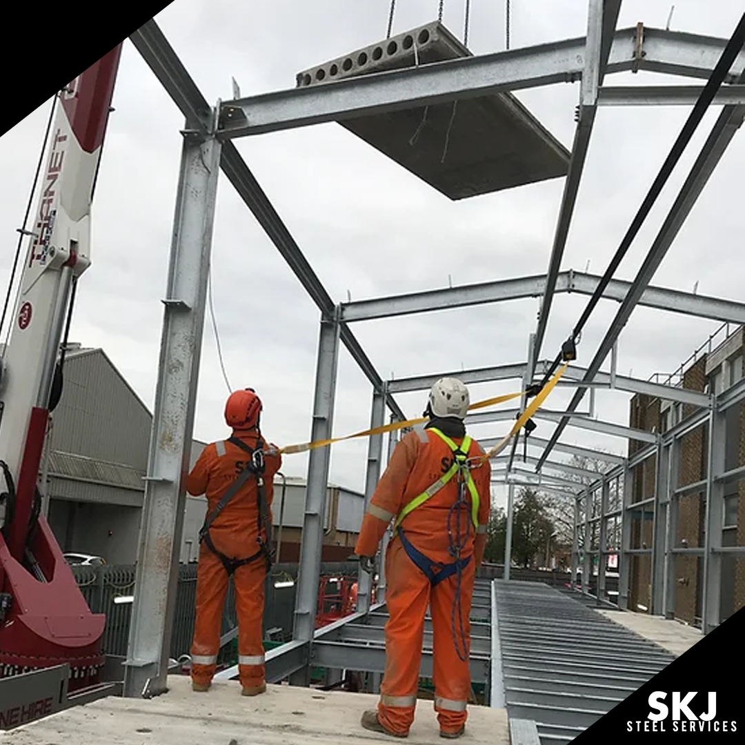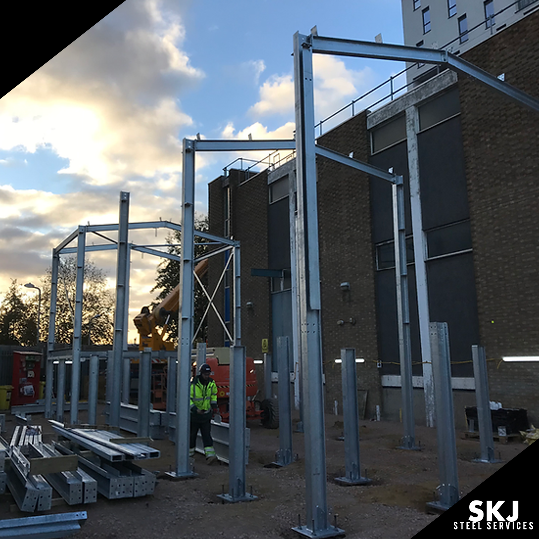 Verny Road was a project SKJ site team was brought in to install a new building for N power network. This project started with the team setting the stud work out to the right heights and distances to the correct design grid lines. This is really important to get right, as can throw the whole building out. Once the studding was set out the crane could come and start installing all the columns, the crane was set with slew restriction to minimise any danger of us getting close to the building, all columns and internal steel went in very smoothly without any problems. Once the building was tied in, the bracing could then be added. Their site engineer then came out to check our heights and was happy with every column, so could move on with the installation. All internal steel to take the slab flooring was then installed, followed by the cable trays at the top of the building. The site team had a tricky installation as they had to allow space for the slabs to be floated in, good planing and a good sequence allowed this install to go smoothly. Once all the tabs were installed the finishing of the building could be installed i.e. Perlins, sheeting rails and 4 staircases with handrails and grating flooring. In all this was a very impressive install and the SKJ site team worked very safely and efficiently with a number of MEWPS as it was a very small area.